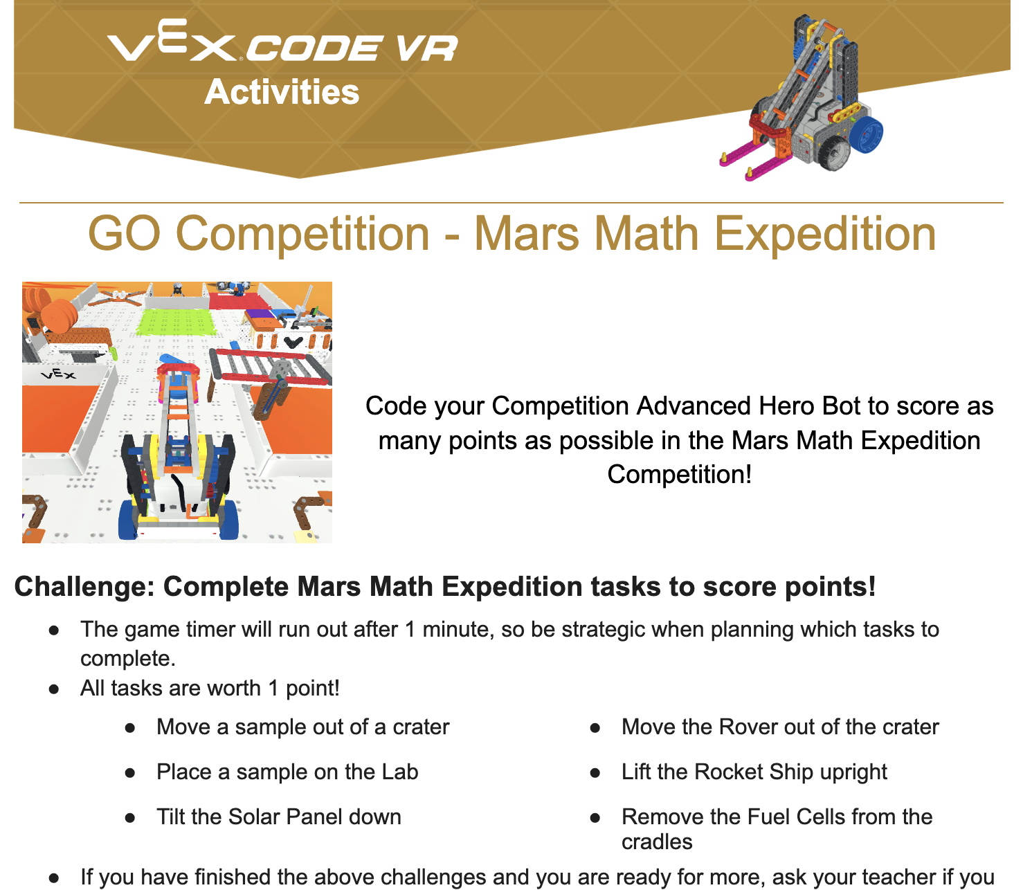 The VEX Continuum has many points of entry and customization into Space education. And provide effective resources that develop the skills, knowledge and understanding need for many different kinds of jobs involved in commercial space missions and launch operations. The VEX IQ, VEXcode VR, VEX EXP & V5 and V5 Workcell platforms are at the ready today, right now, to deliver curricula, games, challenges and employer-customized activities that drive workforce competencies and knowledge needed for a viable commercial Space industry.For example, parameters in VEXcode Vr challenges can be set to non-Earth environments and simulate missions to the Martian surface, deep space, Low Earth Orbit and the very accessible high-altitudes, like the Edge of Space zone. The Mars Math Expedition Site when debris is cleared.In my view, this is a great example of how we make STEM learning interesting, imaginative and actionable for young people who are otherwise disconnected from academics. VEX offers a great way to jumpstart careers of experienced workers who won't upskill/reskill in a community college classNameroom for three hours on Wednesday nights, or by taking an Intro to Physics className online.for manfucturing, scientific research, and good old fashioned human exploration.that will be commercially and privately accessible in their lifetimes (if not already). job training and with total-package curricula and tools to on Mars. This is particularly useful as the such as and, or even These simulations and challeges can replicate real-world, off-earth scenarios - like operating robotic arms and conveyor systems from hundreds of thousands of miles away, if not more, in extreme conditions. And increasing their confidence and competency in engineering principles while developing their ability to think critically within complex aerospace scenarios.