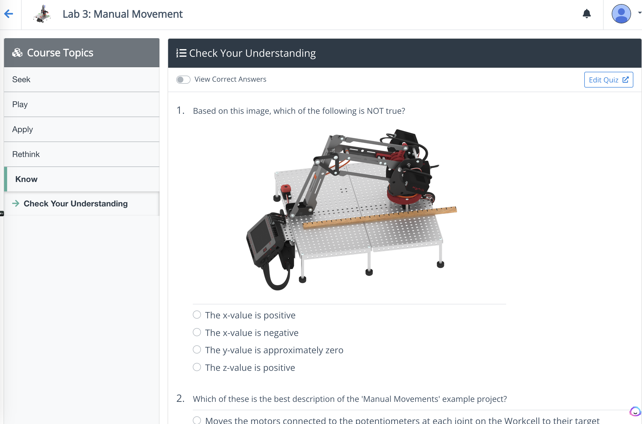 Workcell is a cost efficient option to instruct industrial robot mastering. Mastering an industrial robot is the process of identifying with precision the geometrical parameters in an robot's kinematic structure. This is essential in making sure that the robot functions as programmed and completes its tasks safely, precisely and efficiently. Additionally, it provides roboticists with insight into how to make quick adjustments when needed, or how to enhance the accuracy and repeatability of robotic motion. The V5 VEX Workcell has potentiometers that are also used to know where the arm of the Workcell is in three-dimensional space.